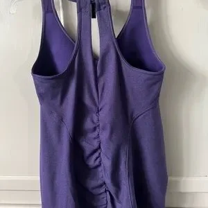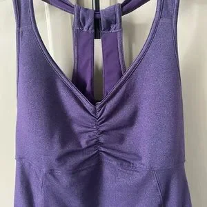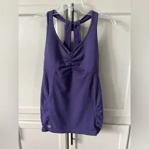 Athleta Tree of Life Racerback Tank. Purple. Bra very lightly padded to offer support. Ruching on Sides and Back. Perfect tank for yoga. *Minor pilling (see photos). Sold AS IS. No CANCELLATIONS or REFUNDS. Nylon, Poly and Lycra.