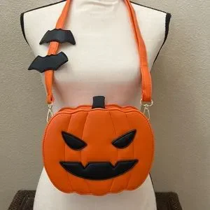 So cute!! Brand new pumpkin crossbody. Adjustable strap, gold accents. Two bats on the strap. Two pockets inside the purse, one zipper. See pics for more details.