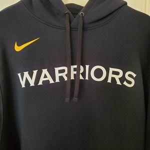 -Soft cotton/polyester blend hoodie with large white Warriors & yellow Nike swoosh logo on front