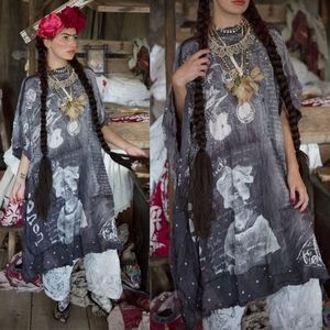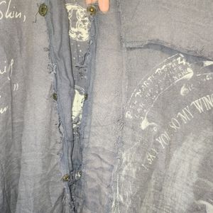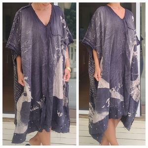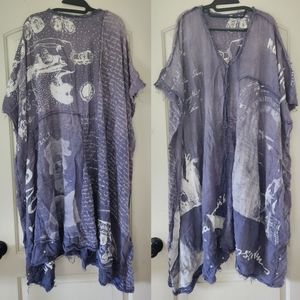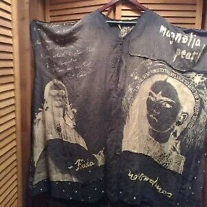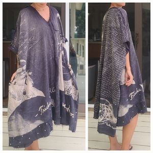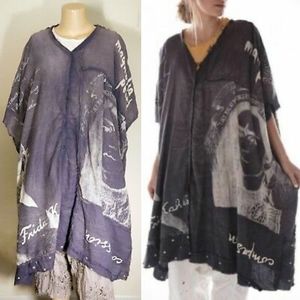 Rare, rare, rare! Frida Kalho patchwork art graphic Jaya Caftan in Ozzy dark gray charcoal by magnolia pearl. One Size. A beautiful kaftan style dress that buttons all the way down, so it can also be worn multiple ways, as a dress, backwards with the v in the back, or open as a kimono robe duster cardi shawl. Stunning patch work collection of all Robin's Frida art graphic images fabricated in the most delicate tissue paper thin flowy cotton material. Cotton twill frida collection jaya caftan dress 464 with patching and hand stitching snap closures ozzy lavender lilac water dip dye. One of the most highly sought-after unicorns of all MP collectors. Selling for what I paid. All distressing is intentional. No trade please. The price is firm and reflects high % posh fee, way way way above retail price I originally paid, demand, rarity, tax & postage spent etc. No offers. All MP items are heavily distressed with intentional holes, cracks, fading, paint splatters, raw shredded edges, sandblasting, fraying, sunfading, rips, raw cut-up hemline to make them look worn & threadbare. Extremely rare Kimono from the Frida Kahlo collection by Magnolia Pearl. This Kimono also depicts the letter to Georgia O’keeffe. Dark bluish/periwinkle grey hue with snaps down front and short sleeve.