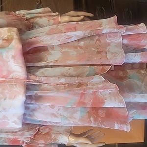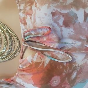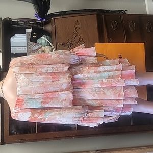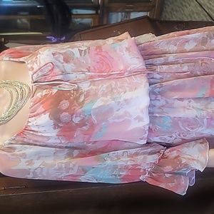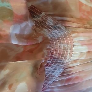 Boston Proper Blurred Bouquet Peasant Multicolor Dress, elastic waist, tie up front elastic sleeve length sheer