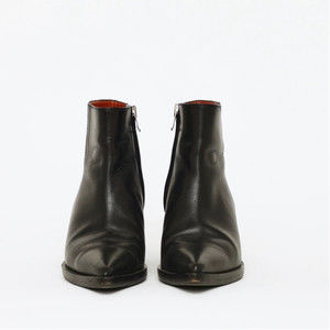 Pre-owned Acne Studios black leather Cony ankle curved wedge boots featuring a pointed toe, inside zip closure, stacked wedge heel, and rubber outsole.