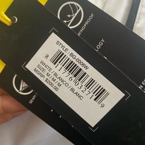 Full zip hooded weatherproof jacket. Outer shell is nylon; material changes to a plaid when it gets wet. Jacket is waterproof, windproof, and breathable.
