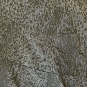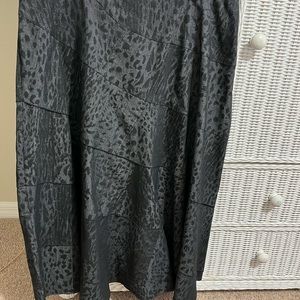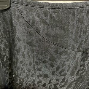 It’s hard to describe this really cute, midi-length skirt by Sandro Sportswear. Size Misses 16. It is New w/o tags from a clean, smoke-free home. Never Worn. Fit & Flare Style with hidden side zipper. 32” long. Flat front, waistband measures 18” across. Fabric feels like a stretch denim. Skirt is fitted through belly then flares to a swooping hem. Fabric is cut on the bias, pieced together and tiered. Black with a subtle animal print in fabric. 69% cotton, 28% polyester, 3% Spandex. Machine Washable.