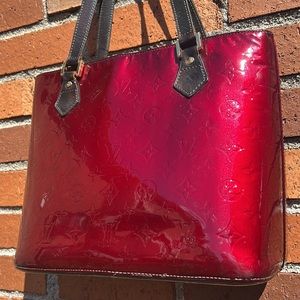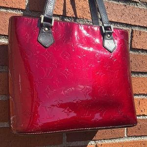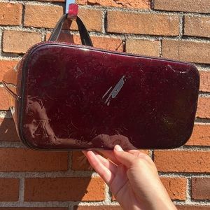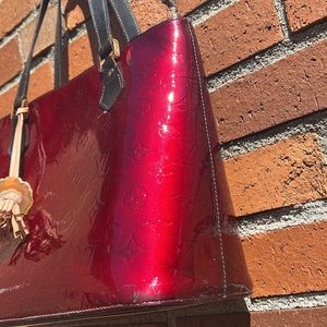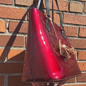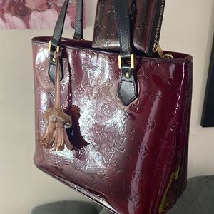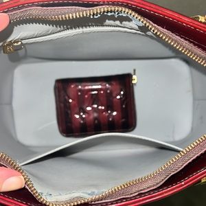 This is a custom dyed purse that looks like a dark, maroon or burgundy in some lighting, and other lighting it looks like a dark candy, apple red, and in other lighting it looks like a cherry red. It does not match exactly with the wallet that I bought separately, the wallet is original, has not been altered. The inside of the purse is peeling just a little bit at the top but inside looks great no major, stains or damages. The exterior of the purse does have some scratches, mainly along the bottom and corners, and where this little charm has been swinging back-and-forth. I will be posting more pictures of the interior of the purse and of the wallet in a separate post along with measurements, but the purse and wallet are for sale, they are both authentic.