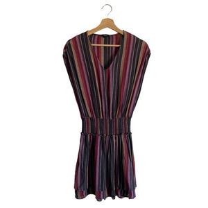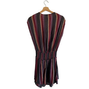 Purple, Black, Pink, Tan, and Burgundy Sleeveless Striped Dress.