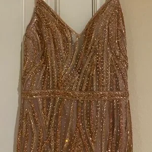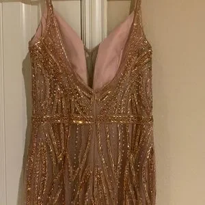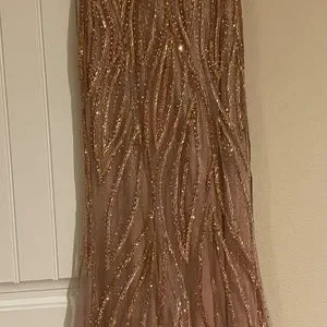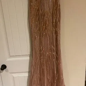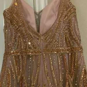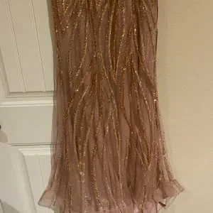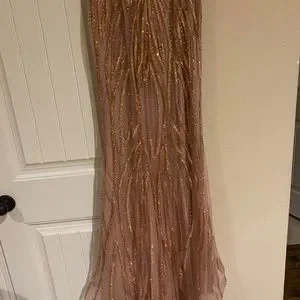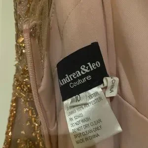 An Andrea and Leo Couture design in a size 10, blush champagne color. The dress is long and fitted and flares a little at the bottom with thin straps and layered with tulle and intricate bead embellishment.