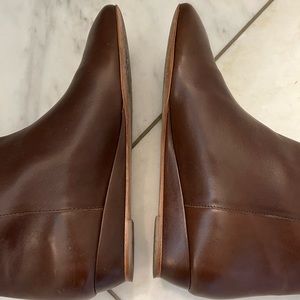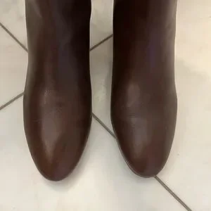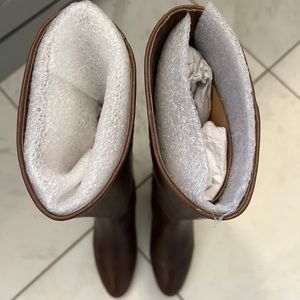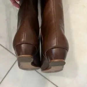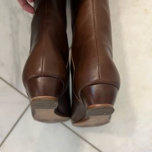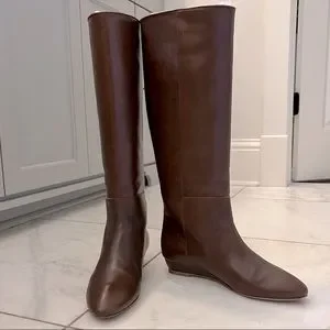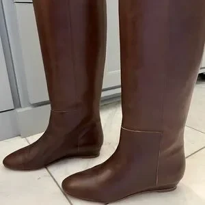 Loeffler Randall leather knee boot. 1” covered demi-wedge heel. 15 1/2"H pull-on shaft; 12" circumference. Almond toe; tonal topstitching. Leather lining and sole. Made in Brazil. Excellent condition! The only flaw I see is a tiny scratch and tiny gold mark on the very tip of the shaft of one boot (see photo). I take very good care of all my designer boots, storing them in the box with paper and foam filler to maintain their shape.