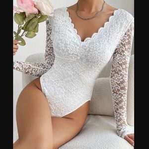 🌟NEW, CUTE**- White V-Neck Long Sleeve Lace Trim Bodysuit | OFFERS WELCOME!