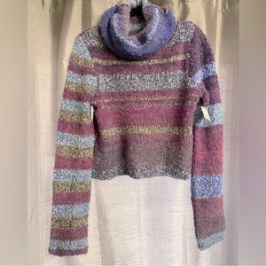 Feel the warmth of this tactile knit sweater with a cozy turtleneck and fuzzy stripes. Beautiful fit, true to size! Fabric is very soft and super stretchy so it is fitted to the body.