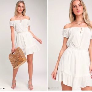 Arena Ivory Embroidered Off-the-Shoulder Mini Dress. Lined skirt.