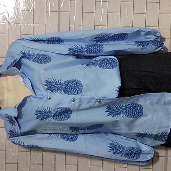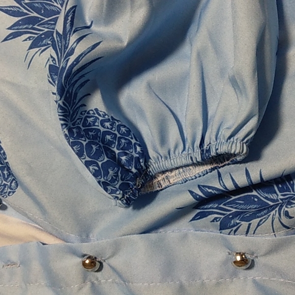 Pretty Blue shirt with Pineapple graphics all over. The shirt has silver buttons down the front and elastic at the wrists. the shirt has no manufacturer label.