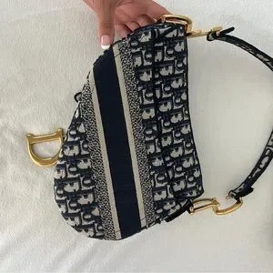 The design is fully embroidered with the House's hallmark blue Dior Oblique motif. The legendary style features a Saddle flap and a D stirrup clasp on a magnetic pull, as well as an antique gold-finish metal CD signature on each side of the handle. The bag can be carried by hand or worn over the shoulder and may be customized with different shoulder straps.