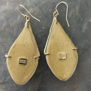 An oval or elongated teardrop silhouette in handcrafted Lucite by Alex Bittar. Gorgeous Lucite glows with every turn from deep to light. Decorated with a gold branch which wraps the earrings and is encrusted with sparkling crystals. The artist's signature on back of each earring. 2” long x 1” wide the photo with the earring worn appears to be clear, but that is just depicting what the hearing looks like on and not the color show here