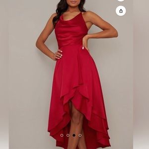 Chi Chi Red Halter Cowl Neck Tiered Silky Dip Hem Midi Dress in Red ,size 4