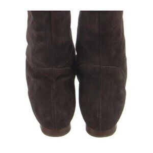 Chloé designer over-the-knee boots in a rich chocolate brown suede. Features soft leather trim, round toe, low 0.75" stacked heel, and signature lace-up detail at the back of the shaft. No zipper. Elegant and timeless silhouette with a slightly equestrian edge.