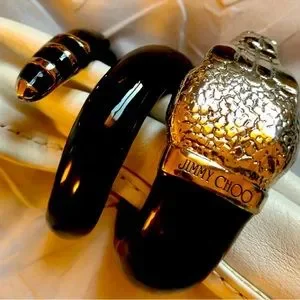 Includes Black and silver Jimmy Choo signature hardware. Medium sized bag that will fit a good variety of items (glasses, keys, wallet, lipstick, compact, phone, etc.). Minor show of use.
