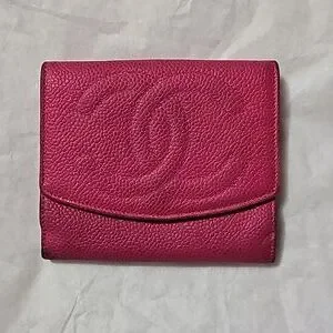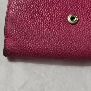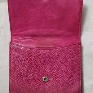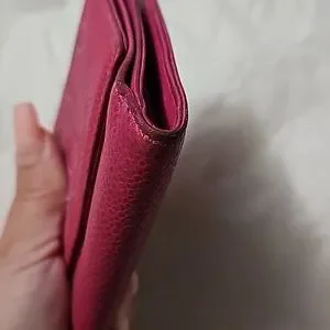 Pink caviar leather compact wallet. Interior lined in lambskin leather. 6 Credit card slots. Cash slot.