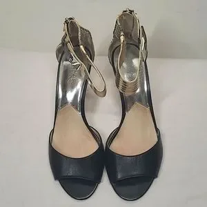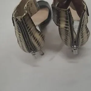 Michael Kors Women's Size 9.5 Black & Ivory Leater Snake Skin Print Sandals. Zipper Back w/ Elastic in ankle strap Approximately 3 inch heel