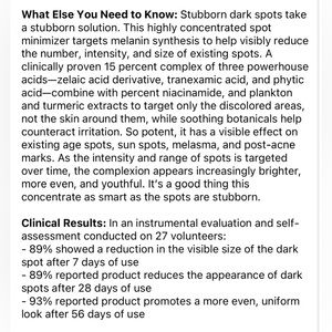 ✨ A targeted, daily concentrate with 21 percent brightening agents to help fade the look of stubborn dark spots, such as sun spots, age spots, post-acne scars, and melasma, before, during, and after dark spot formation.