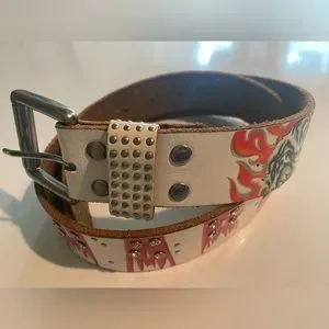 Ed Hardy classic Y2K style retro traditional tattoo print Tattoo City genuine leather belt with rhinestones and studs. Sturdy heavy duty nickel metal buckle. Crackle in print from age and wear, but lots of life left, high quality material. Asian inspired motif.