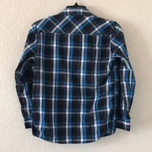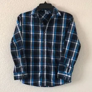 Like new condition! This button down shirt is black with blue and white plaid print.