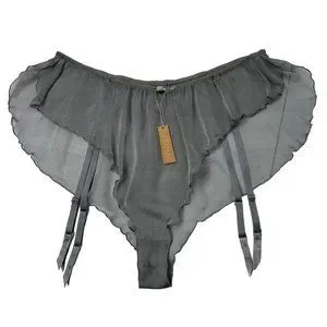 A flirty sheer lingerie bottom with a silky soft feel, removable garter straps, and a feminine center front rosette detail. Features a cotton gusset lining. Fits true to size.