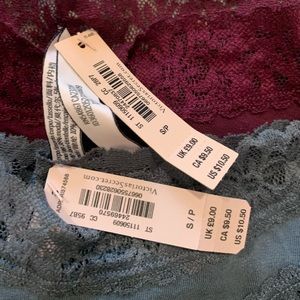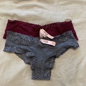 Two brand new with tags pairs of Victoria Secrets Small Cheeky Panties. Adorable purple and grey panties with lace. Excellent condition.
