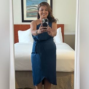 PRETTY GARDEN Women's Ruched Bodycon Dress Sleeveless One Shoulder Wrap Satin Belted Cocktail Midi Dress - Size Large. Worn once for a wedding. I think the color is teal green but the description when I bought it was “dark blue”.