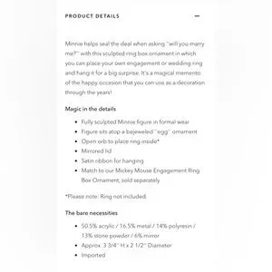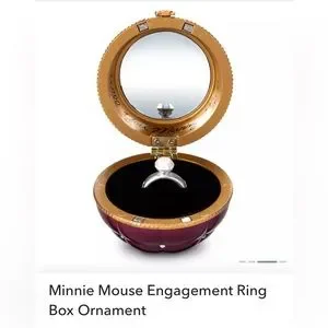 Minnie helps seal the deal when asking "will you marry me?" with this sculpted ring box ornament in which you can place your own engagement or wedding ring and hang it for a big surprise. It's a magical memento of the happy occasion that you can use as a decoration through the years!