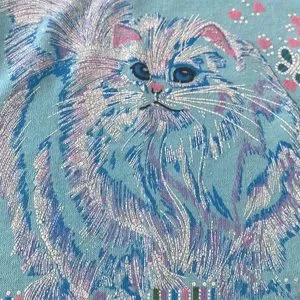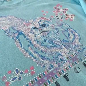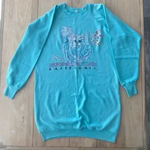 *Turquoise blue vintage 80s sweatshirt dress with a front graphic of a Persian cat, hearts and butterflies and the word “California”