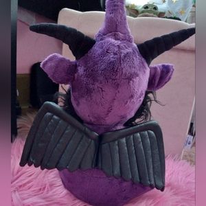 he features vegan leather wings, hands, and feet. he is as black as your soul and purple w cute deep red eyes and sweet pentagram on his forehead beside his cute devil horns! he sports a super righteous beard also! he comes with a dust bag, he is new & has his tags attached!