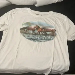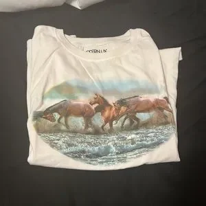 Machine wash cold water with similar colors inside out and only non chlorine bleach when needed. Do not iron the horse picture