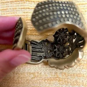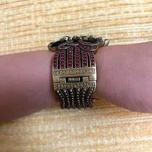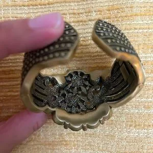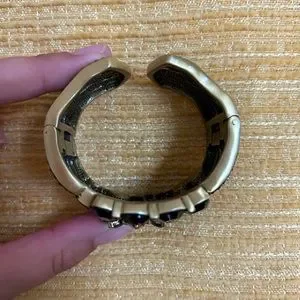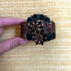 Stunning and dresses up any outfit! Brass tone hardware. Hinged and easy to wear. My wrist is medium-sized, measured 7” around, and I still have a bit of room. Pair with jeans or a dress - what a stunner! Very reminiscent of Victorian or antique Czechoslovakian bohemian jewelry. Estate item. Thank you for looking!!!