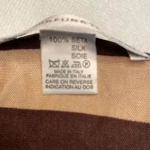 Beautiful vintage Diane Von Furstenberg oblong silk scarf combining brown/beige/white/yellow/orange/coral/pale blue in both a scribble/abstract pattern on one side, stripe pattern on reverse (double thickness). Measures approximately 67in long and 5-1/4in wide. In excellent pre-loved condition. From a smoke free home.
