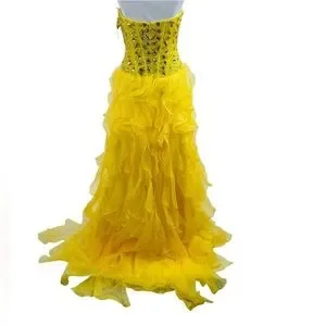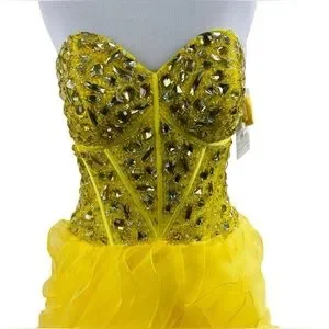 Built in molded bra cups and corset boning. Hidden zipper. Car wash / jellyfish ruffled skirt. Gorgeous sparkly gold beads on bodice. Stunning!!
