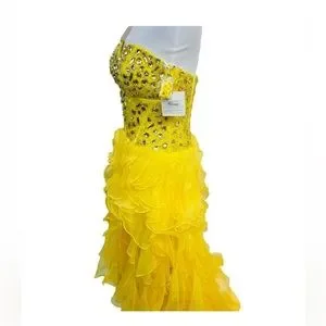Gorgeous sunny lemon designer dress from Giosue. Brand new with tags- never worn. Comes with matching wrap. Designer size 8- however fits like a US size 4.measurements approx: Bust 16”, Waist 14”, Hips 18”, length at shortest 24” length at longest 52”