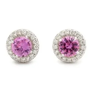 The earrings are of diamond embellished halo design and cast/assemble manufacture. The earrings contain two prone set round shape natural pink sapphires measuring approximately 5.00mm in diameter.