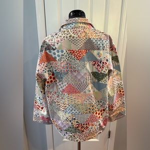 Featuring a mélange of dainty floral motifs, this patchworked layer is a charming match for your favorite denim and clogs.