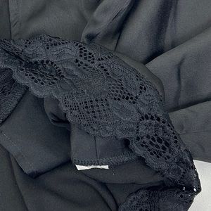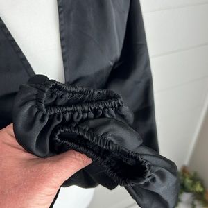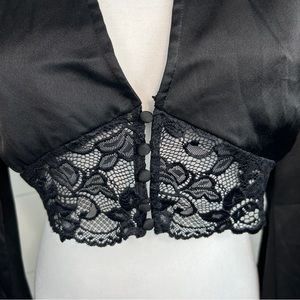 Black satin cropped silhouette, plunging V-neckline, button closure, lace trim, and blouson sleeves