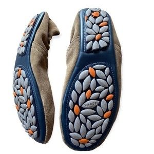 These are Acorn suede flats they are a khaki brown color and the cushion on the inside is thick and comfy. They were worn once and a size 7.