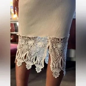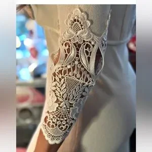 Family owned and run company, making beautiful, luxurious dresses since 1980’s in the Philadelphia area. This dress is a below the knee figure hugging knit sheath, worn with super luxurious lace & crystal bolero jacket. Sorry we forgot to take photo with just dress without the bolero…. I show you dress on chair… double V neck trimmed in rich cream satin.