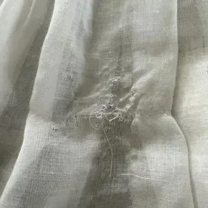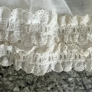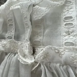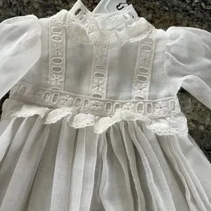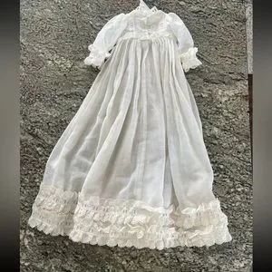 Beautiful Long Gown Specifically Made for Shader’s China Dolls. Has a spot on the back where the material seems to have gotten a run. See picture for detail. Has hole flower embroidered lace on bottom and on sleeves.
