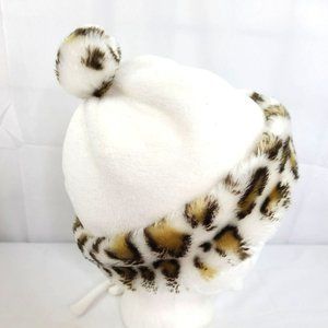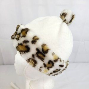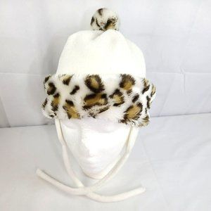 EUC Animal Leopard Print Youth 2-4T Trapper Beanie Cap Hat Ivory Earflap Tie