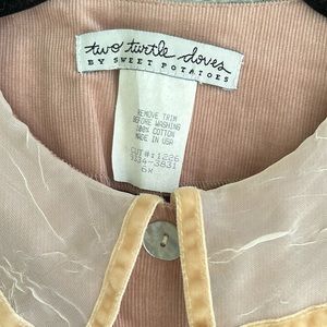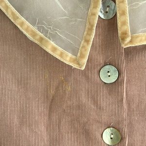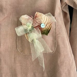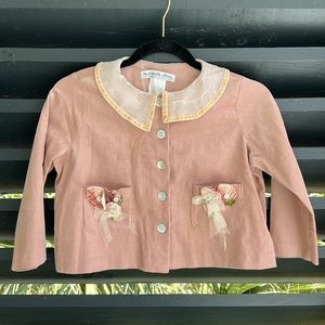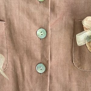Mauve Pink, Corduroy Jacket with 5 Button Closure, Sheer Collar Trimmed in Cream Velvet Ribbon, Feont Pockets with Button On Floral Appliqués that remove for cleaning. Jacket has stains see pics 6 and 7. Could come out with TLC