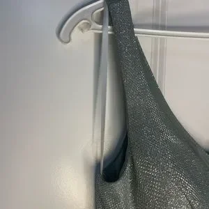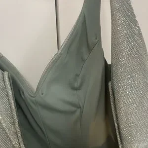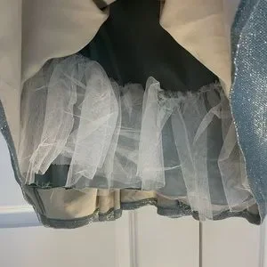The color is blue and grayish with sparkles all over it(the pictures make it look darker but it’s a super bright and sparkly dress.)