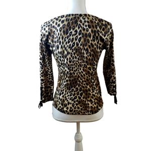 Silk Blend Womens Medium Knit Top Leopard Animal Print 3/4 Sleeve Lace Up Detail