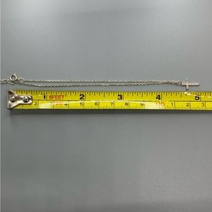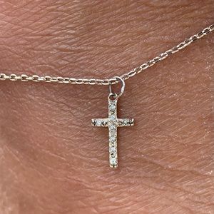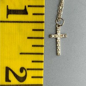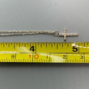 The chain measures approximately 10” with a 1” extension chain. The tiny CZ cross is approximately 1/2” tall. This is a dainty chain in excellent used condition.