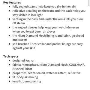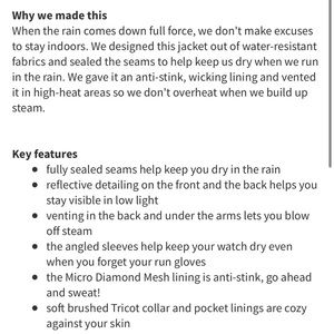 Incredible rain coat by Lululemon. Hard to find this style but really good quality piece. Take care!
