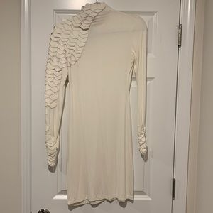 Worn once. Rare color (true ivory). Purchased at Akira Chicago. CURVE HUGGING ❤️ Very soft, thick feel, stretchy material. Long sleeves are ruched on the cuffs. Has a mock neck and hidden zip. Faux leather scales (or feathers if you’re more into birds). This dress deserves more love than I’ve given it.